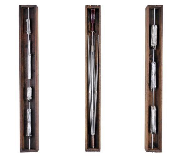 A doce senhora de olhos claros e cabelos grisalhos, Marly, de fala mansa e jeito meigo, quando entra em seu atelier assume uma personalidade ainda mais rica e forte, nem sempre fácil de compreender diante de uma figura tão singela. Seus quadros são de “tirar o fôlego”, fantasmas ganham tridimensão como se saíssem de fato do tecido em que foram pintados. Suas gamelas esculpidas dão novos caminhos a xilo, que também se apresenta em enormes folhas de papel, demonstrando segurança e habilidade no ato de gravar. Atualmente, seu objeto eleito é o guarda-chuva. Com pano, sem pano, novos, velhos, de crianças, costurados a tela, dissecados,, pendurados em paredes, desnudados, tratados até parecerem de couro, gravados, estampados, inauguram uma nova linguagem para algo tão comum. Para a exposição Marly criou dois conjuntos de obras compostas por caixas de madeira enceradas com óleo diesel, e guarda-chuvas cortados na maquita e atravessados por grandes parafusos. O resultado corresponde a uma verdadeira obra de arte contemporânea, com toda inquietude e instigação que lhe são próprias. Bem distante do universo bucólico que se antevê ao conhecer Marly.