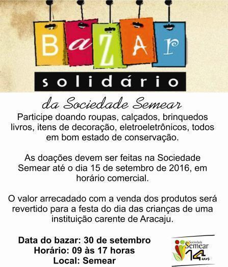 A Sociedade Semear vai realizar um bazar solidário no dia 30 de setembro, na sede da instituição, das 09 às 17 horas, com o objetivo de arrecadar fundos para a realização da festa do dia das crianças de uma instituição carente de Aracaju.