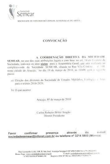 A Coordenação Diretiva da Sociedade Semear convoca todos os seus sócios para uma Assembleia Geral que acontecerá no dia 19 de março de 2018, às 16 horas na sede da Semear, situara à Rua Vila Cristina, 148, bairro São José, para eleição dos diretores para o biênio 2018-2020.
