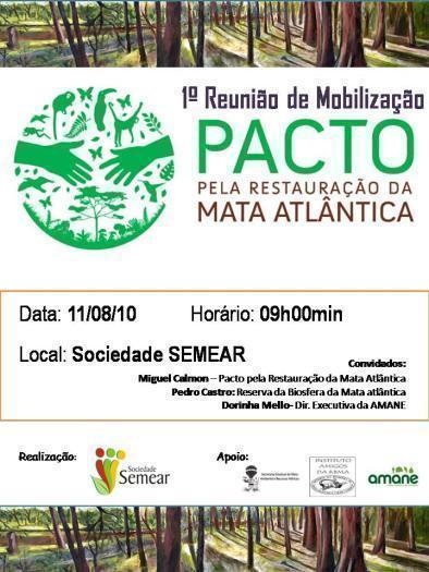 A Sociedade de Estudos Múltiplos, Ecológicos e de Artes e a Secretaria Estadual de Meio Ambiente e dos Recursos Hídricos, através da Superintendência de Biodiversidade e Floresta convida a população sergipana para participar da Apresentação do Pacto de Restauração da Mata Atlântica, que acontecerá no dia 11 de Agosto, quarta-feira, no auditório da Semear no horário das 8:00 às 12:00. Estarão presentes no evento o coordenador do Pacto da Restauração da Mata Atlântica, Miguel Calmon e o representante da Reserva da Biosfera da Mata Atlântica, Pedro Castro.