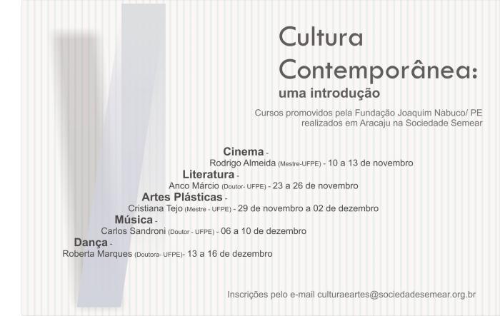 Prossegue entre os dias 23 e 26 de novembro o “Programa de Estudos da Cultura: formação em arte e cultura contemporânea”, módulo Literatura, abordando as “Influências da Literatura Moderna na Literatura Contemporânea”. As aulas serão ministradas pelo professor Doutor da UFPE Anco Márcio das 19h às 22h no auditório da Sociedade Semear. O projeto é uma parceria entre a Fundação Joaquim Nabuco e a Sociedade Semear, com o objetivo de atender a demanda por formação em arte e cultura contemporâneas, promovendo um curso de caráter mais introdutório e formativo, apresentando questões pertinentes ao campo da cultura nas suas mais diversas linguagens.