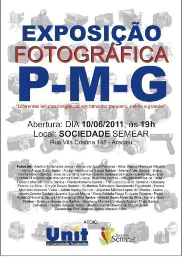 Será nesta sexta-feira, dia 10 de junho, a abertura da "Exposição Fotográfica PMG - diferentes leituras imagéticas em tamanho pequeno, médio e grande", dos alunos de Design Gráfico e Jornalismo da Universidade Tiradentes. São fotos em em três tamanhos produzidas pelas turmas neste primeiro semestre de 2011. A curadoria é do Professor Manoel Dantas Macedo Filho. O coquetel acontece a partir das 19 horas, no anexo da Galeria Jennere Augusto, na Sociedade Semear.