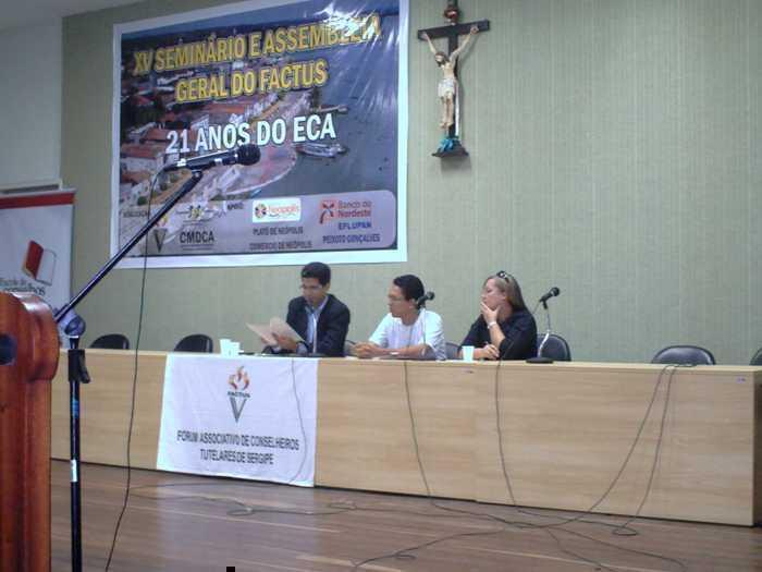 No último dia 29 de Julho, a equipe técnica da Escola de Conselhos de Sergipe participou do XV Seminário e Assembléia Geral do FACTUS (Fórum Associativo dos Conselheiros Tutelares do Estado de Sergipe), realizado na cidade de Neópolis (SE), e que teve como tema os 21 Anos do Estatuto da Criança e do Adolescente – ECA. Na oportunidade a Secretária Executiva da Escola de Conselhos, Telma Souza Santana, proferiu palestra com o tema “O Sistema de Garantia de Direitos” e posteriormente abordou os trabalhos que estão sendo desenvolvidos pela Escola de Conselhos e sobre a necessidade de participação dos conselheiros nos cursos de capacitação.