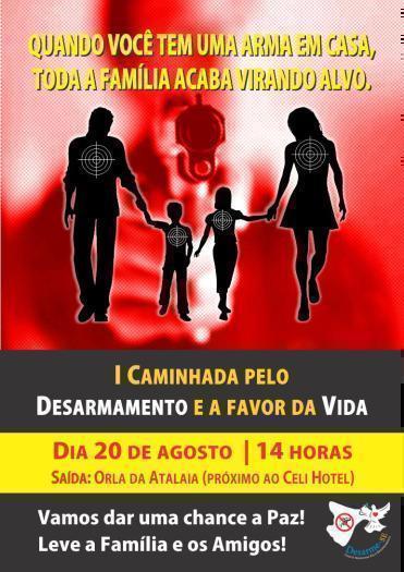 No próximo sábado, dia 20, acontece a “I Caminhada pelo desarmamento e a favor da vida”, com o slogan “Quando você tem uma arma em casa, toda a família acaba virando alvo”, na Orla de Atalaia, com saída próximo ao Hotel Celi, a partir das 14 horas. O evento faz parte da campanha pelo desarmamento, lançada no dia 06 de maio de 2011, que tem como objetivo mobilizar a sociedade brasileira para retirar de circulação o maior número de armas de fogo possível e contribuir para a redução da violência no País. O Diretor Presidente da Sociedade Semear, Carlos Britto, e o Diretor de Meio Ambiente, Waldson Costa, fazem parte da Comissão responsável pela discussão da Campanha pelo Desarmamento em Sergipe, através do Comitê Sergipano Pelo Desarmamento. Participe!! Leve a família e amigos !!