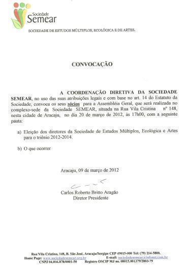 A COORDENAÇÃO DIRETIVA DA SOCIEDADE SEMEAR, no uso das suas atribuições legais e com base no art. 14 do Estatuto da Sociedade, convoca os seus sócios para a Assembléia Geral, que será realizada no complexo-sede da Sociedade SEMEAR, situada na Rua Vila Cristina, nº 148, nesta cidade de Aracaju, no dia 20 de março de 2012, às 17h00, com a seguinte pauta: a) Eleição dos diretores da Sociedade de Estudos Múltiplos, Ecológica e Artes para o triênio 2012-2014. b) O que ocorrer Aracaju, 09 de março de 2012 CarlosRoberto Britto Aragão Diretor Presidente