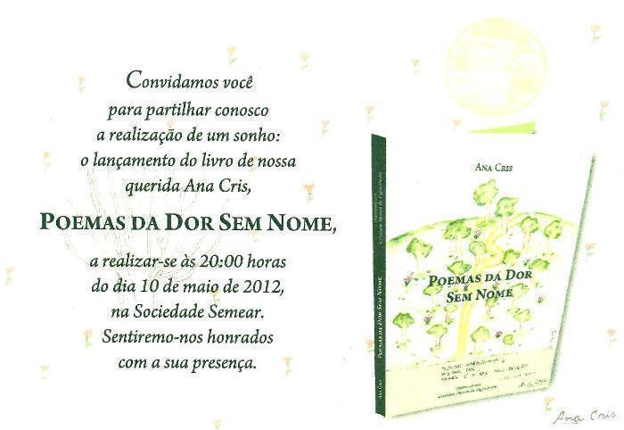 Nesta quinta-feira, dia 10 de maio, Ana Cris lança seu livro de poesias “Poemas da Dor Sem Nome”. O lançamento será às 20h00 na Sociedade Semear. Não perca!