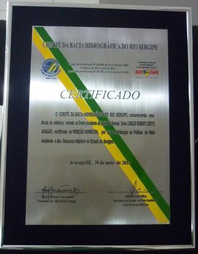 Semear, recebeu do Comitê da Bacia Hidrográfica do Rio Sergipe, uma placa de