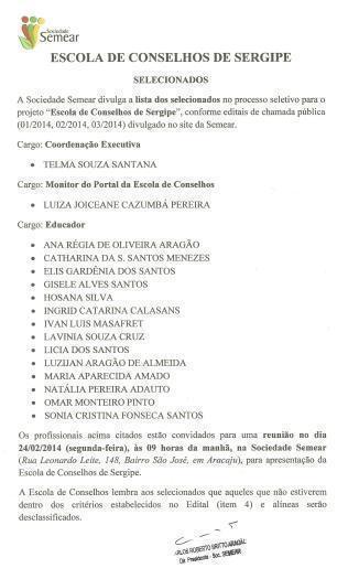 A Sociedade Semear divulga a lista dos selecionados no processo seletivo para o projeto “Escola de Conselhos de Sergipe”, conforme editais de chamada pública (01/2014,02/2014, 03/2014) divulgado no site da Semear. Cargo: Coordenação Executiva Cargo: Monitor do Portal da Escola de Conselhos - · LUIZA JOICEANE CAZUMBÁ PEREIRA