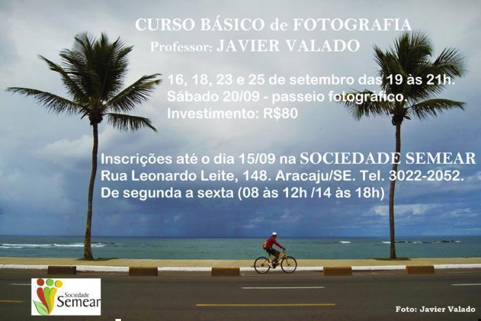 Nos dias 16, 18, 23 e 25 de setembro de 2014 o professor e fotógrafo Javier Valado promove na Semear um curso básico de fotografia, dirigido à pessoas que desejam aprender a utilizar a câmera fotográfica para potencializar suas capacidades criativas e artísticas. O conteúdo a ser trabalhado abordará mecanismos e funções da câmera fotográfica. Composição, regrados terços, retrato, movimento, luzes naturais e artificiais, uso do flash incorporado. Os quatro encontros acontecerão na Semear, das 19 às 21 horas. No sábado, dia 20, os alunos participarão de um passeio fotográfico, em local e horário ainda a definir, para colocar em prática os conhecimentos adquiridos nas aulas. Inscrições (valor R$ 80,00*) e informações na Semear (Rua Leonardo Leite, 148 - São José - Aracaju/SE) até dia 15/09, de segunda a sexta (08 às 12h /14 às 18h) ou através de (79) 3022-2052. Javier Valado.Fotógrafo argentino residente em Aracaju desde 2013. Ministra vários Cursos de Fotografia (Básico, Avançado, Fotografia Criativa, Documental e Fotojornalismo) em diversas instituições da cidade. (CULTART, Casa Rua da Cultura, Rede Coworking, SESC e Studio D - Escola de Fotografia). javivaladofoto@gmail.com /Facebook: Javier Valado / javivalado.wix.com/reivaj