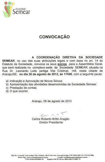 A COORDENAÇÃO DIRETIVA DA SOCIEDADE SEMEAR, no uso das suas atribuições legais e com base no art. 14 do Estatuto da Sociedade Semear , convoca os seus sócios para a Assembleia Geral, que será realizada no complexo-sede da Sociedade SEMEAR, situado na Rua Dr. Leonardo Leite (antiga Vila Cristina),148, nesta cidade de Aracaju/SE, no dia 30 de agosto de 2012, às 17 horas, coma seguinte pauta: a) Indicação e aprovaçãode novos sócios; b) Apresentação das atividades desenvolvidas na Sociedade Semear; c) Prestação de contas; d) O que ocorrer.